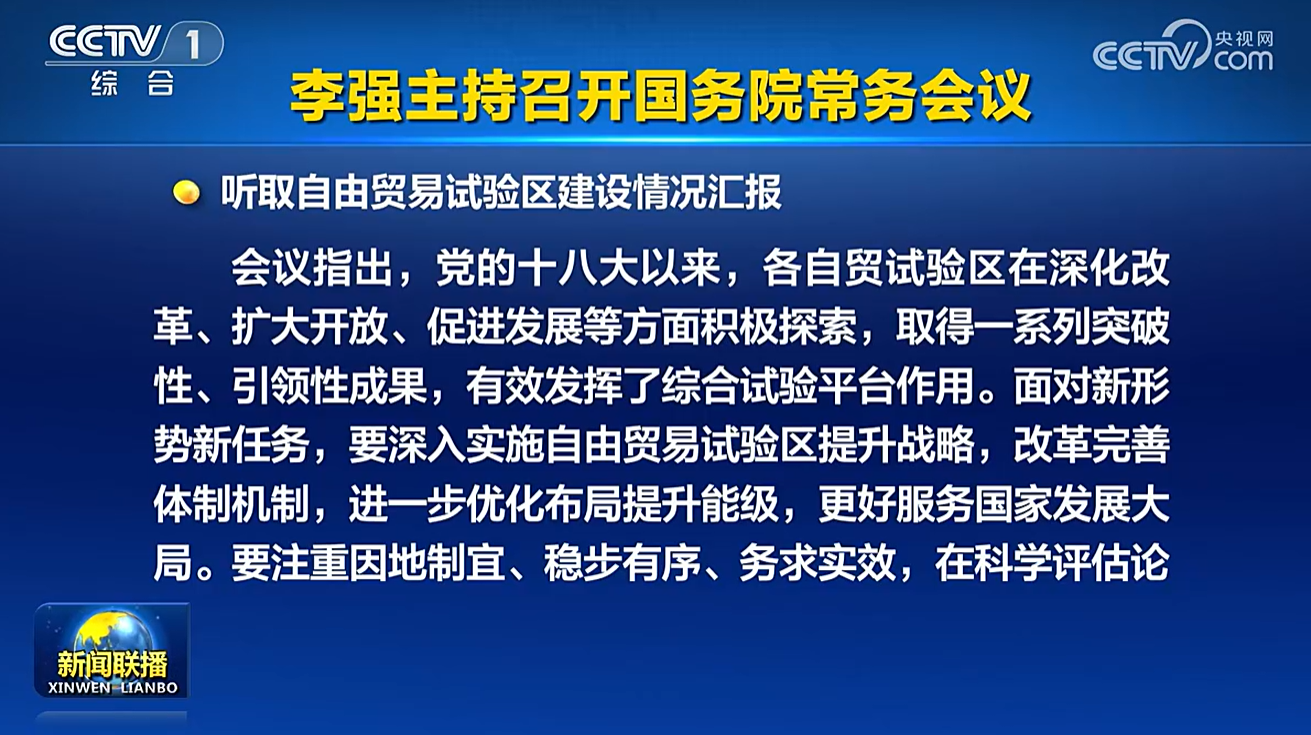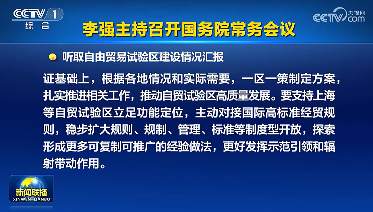 财联社4月17日电,国务院总理李强4月17日主持召开国务院常务会议,听取自由贸易试验区建设情况汇报。会议指出,面对新形势新任务,要深入实施自由贸易试验区提升战略,改革完善体制机制,进一步优化布局提升能级,更好服务国家发展大局。要注重因地制宜、稳步有序、务求实效,在科学评估论证基础上,根据各地情况和实际需要,一区一策制定方案,扎实推进相关工作,推动自贸试验区高质量发展。要支持上海等自贸试验区立足功能定位,主动对接国际高标准经贸规则,稳步扩大规则、规制、管理、标准等制度型开放,探索形成更多可复制可推广的经验做法,更好发挥示范引领和辐射带动作用。 (央视新闻)