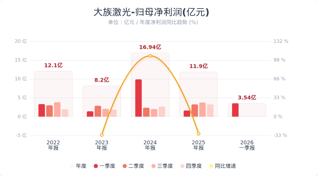 财联社4月20日电,大族激光(002008.SZ)公告称,2026年第一季度实现营业收入51.35亿元,同比增长74.44%;归属于上市公司股东的净利润为3.54亿元,同比增长116.59%。业绩变动主要系公司报告期主营业务大幅增长所致。小财注:公司Q1净利润3.54亿,2025年Q4净利润3.26亿,据此计算,Q1净利润环比增长8%。