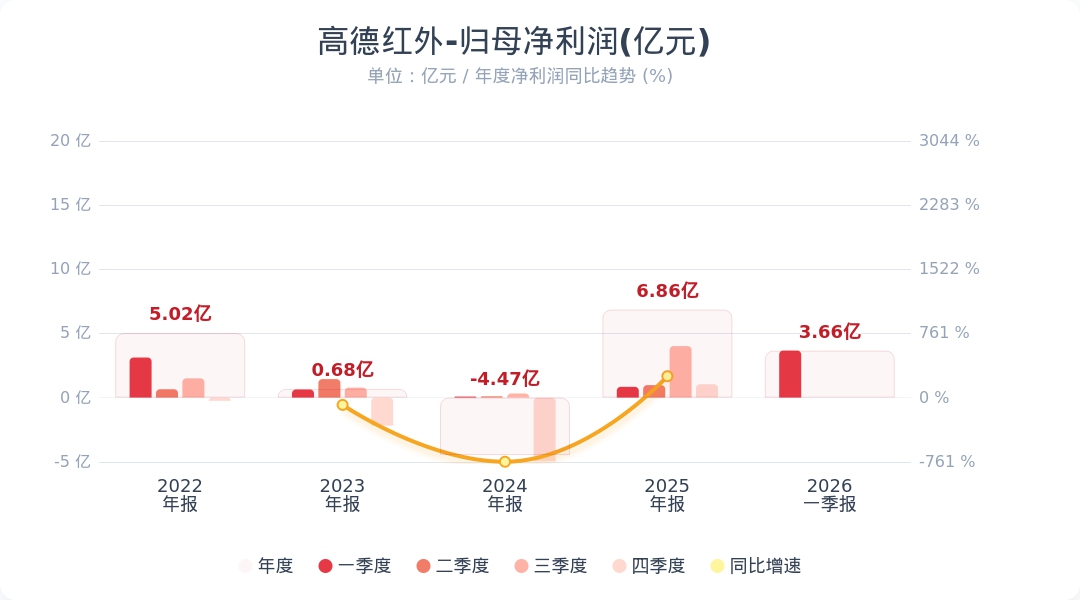 财联社4月20日电,高德红外(002414.SZ)公告称,2026年第一季度实现营业收入12.46亿元,同比增长83.02%;归属于上市公司股东的净利润为3.66亿元,同比增长337.96%。业绩变动主要系型号项目类产品持续交付及民品业务持续增长导致营业收入大幅增长。小财注:公司Q1净利润3.66亿,2025年Q4净利润1.04亿,据此计算,Q1净利润环比增长250%。