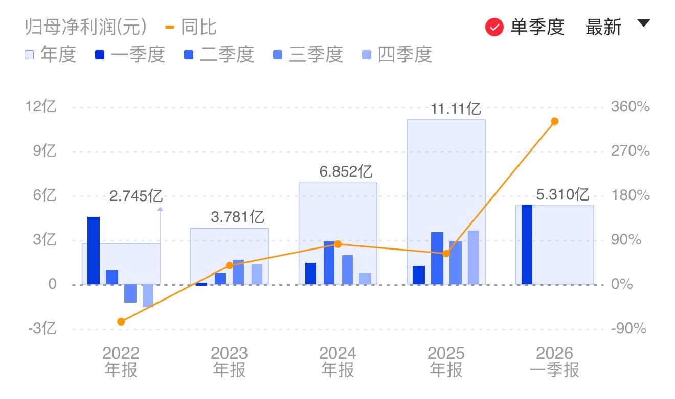 财联社4月20日电,腾远钴业(301219.SZ)公告称,公司2026年第一季度实现营业收入25.59亿元,同比增长75.13%;归属于上市公司股东的净利润为5.31亿元,同比增长330.11%。业绩变动主要系受钴、铜市场行情上行,营业收入增长。小财注:腾远钴业2025年Q4净利3.6亿元,据此计算,2026年Q1净利环比增长47.65%。