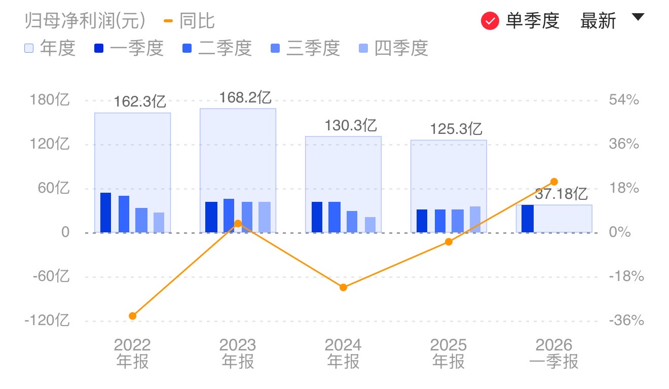 财联社4月20日电,万华化学(600309.SH)公告称,2026年第一季度实现营业收入540.52亿元,同比增长25.50%;归属于上市公司股东的净利润为37.18亿元,同比增长20.62%。业绩变动主要系产品价格上涨,毛利增加所致。一季度乙烯一期装置原料多元化改造优势凸显,3月份受国际原油价格上涨、全球化工产业供需格局改变等因素影响,公司主要产品价格同比上涨,毛利增加。小财注:万华化学2025年Q4净利33.7亿元,据此计算,2026年Q1净利环比增长10.32%。