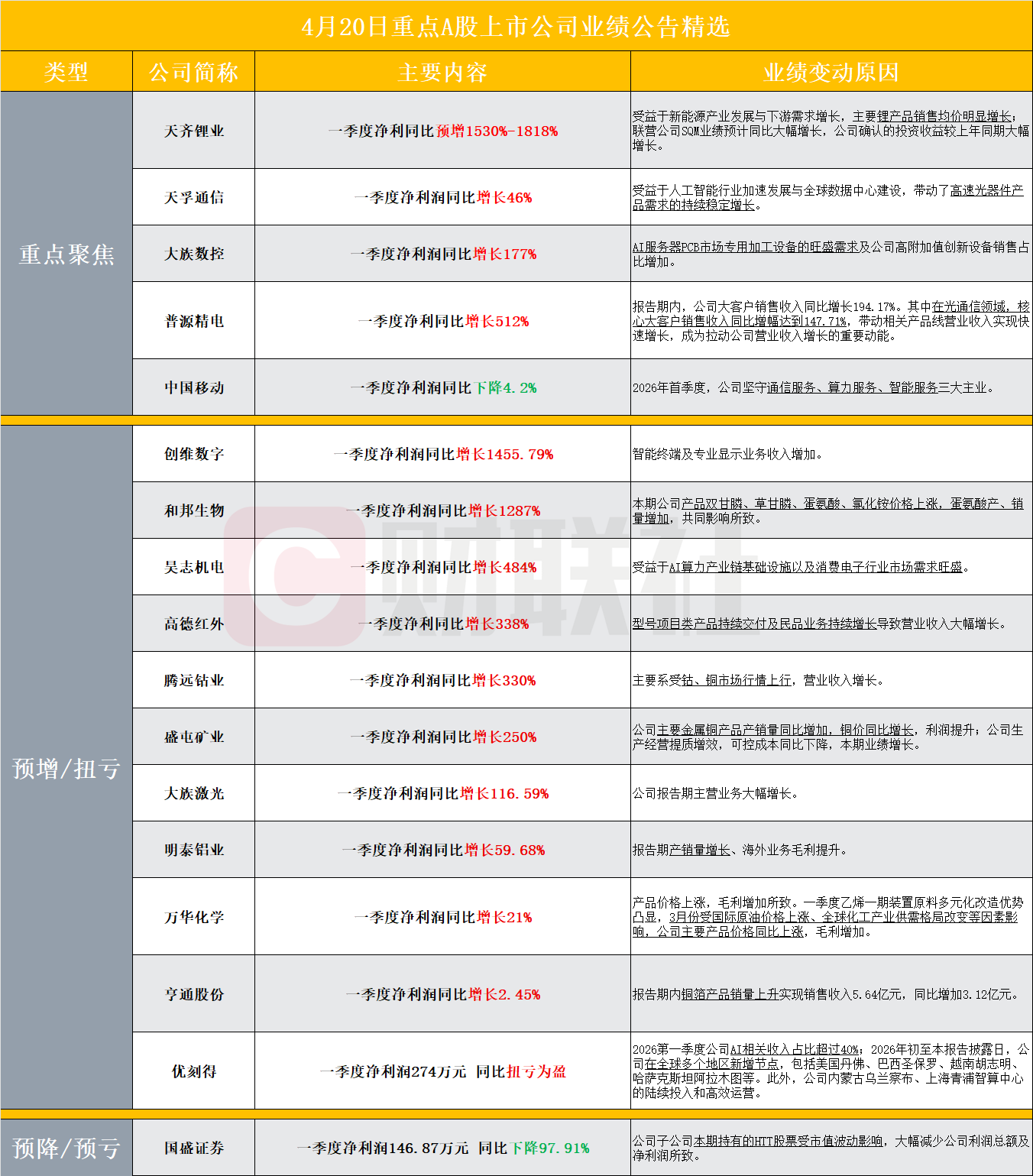 财联社4月20日电,据财联社不完全统计,截至发稿,盘后包括天齐锂业、天孚通信、大族数控、普源精电、中国移动、创维数字、和邦生物、昊志机电、高德红外、腾远钴业、盛屯矿业、大族激光、明泰铝业、万华化学、亨通股份、优刻得、国盛证券在内的多家A股上市公司发布2026年一季度业绩预告/报告。其中,天齐锂业公告,一季度净利同比预增1530%-1818%。天孚通信公告,一季度净利润同比增长46%。小财注:百亚股份、长虹华意、中炬高新、大豪科技周五盘后/昨日发布一季度报告,今日均收盘涨停。