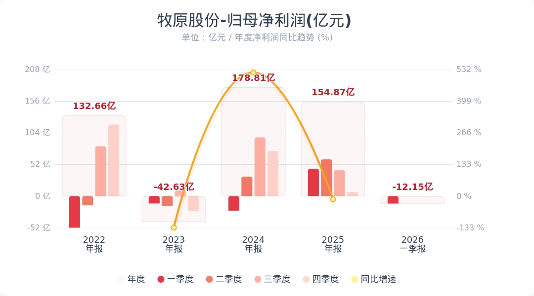财联社4月21日电,牧原股份(002714.SZ)公告称,2026年第一季度实现营业收入298.94亿元,同比下降17.10%;净亏损12.15亿元,同比转亏。业绩变动主要系生猪价格下降,收入减少所致。小财注:公司Q1净利润-12.15亿,2025年Q4净利润7.08亿,据此计算,Q1净利环比由盈转亏。