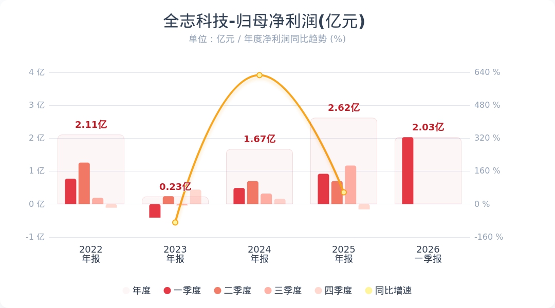 财联社4月21日电,全志科技(300458.SZ)公告称,2026年第一季度实现营业收入9.12亿元,同比增长47.12%;归属于上市公司股东的净利润为2.03亿元,同比增长121.77%。业绩变动主要系报告期内公司因存储芯片及封装价格上涨上调产品售价、新产品量产以及下游客户因涨价预期增加备货致使营业收入同比增加所致。小财注:公司Q1净利润2.03亿,2025年Q4净利润-0.16亿,据此计算,Q1净利润环比扭亏为盈。