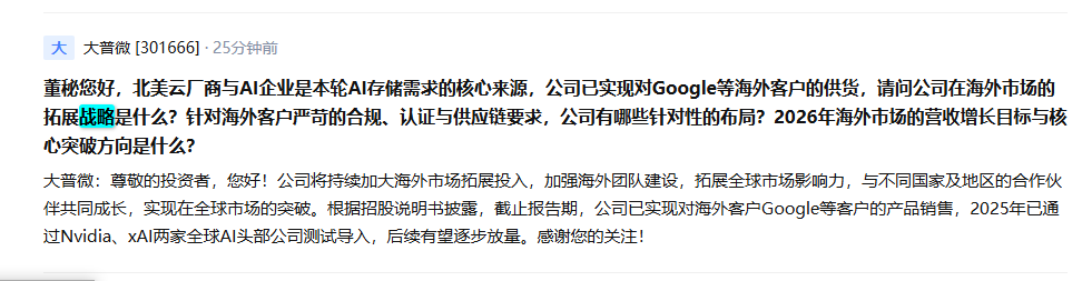 C大普微:已实现对海外客户Google等客户的产品销售 已通过Nvidia、xAI两家全球AI头部公司测试导入