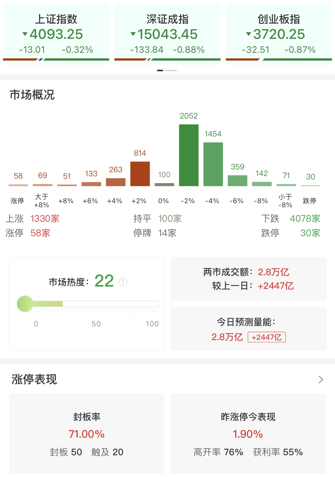 财联社4月23日电,市场震荡调整,创业板指、深成指盘中跌超1.5%,沪指跌破4100点,止步5连阳。中际旭创盘中总市值站上万亿。量能明显放大,沪深两市成交额2.8万亿,较上一个交易日放量2447亿。盘面上,市场热点较为杂乱,全市场近4100只个股下跌。从板块来看,防御性板块走强,其中大消费方向的白酒、零售概念逆势活跃,迎驾贡酒、中兴商业涨停。绿电概念快速拉升,华电辽能3连板,节能风电、绿发电力涨停,粤电力A触及涨停。油气概念快速走高,山东墨龙涨停。算力租赁概念反复活跃,莲花控股、佳力图涨停。燃气轮机概念表现活跃,福鞍股份一字涨停,应流股份涨停创历史新高。下跌方面,有色金属板块调整,西藏珠峰、中稀有色跌停,湖南白银、锡业股份、翔鹭钨业等纷纷下挫。截至收盘,沪指跌0.32%,深成指跌0.88%,创业板指跌0.87%。