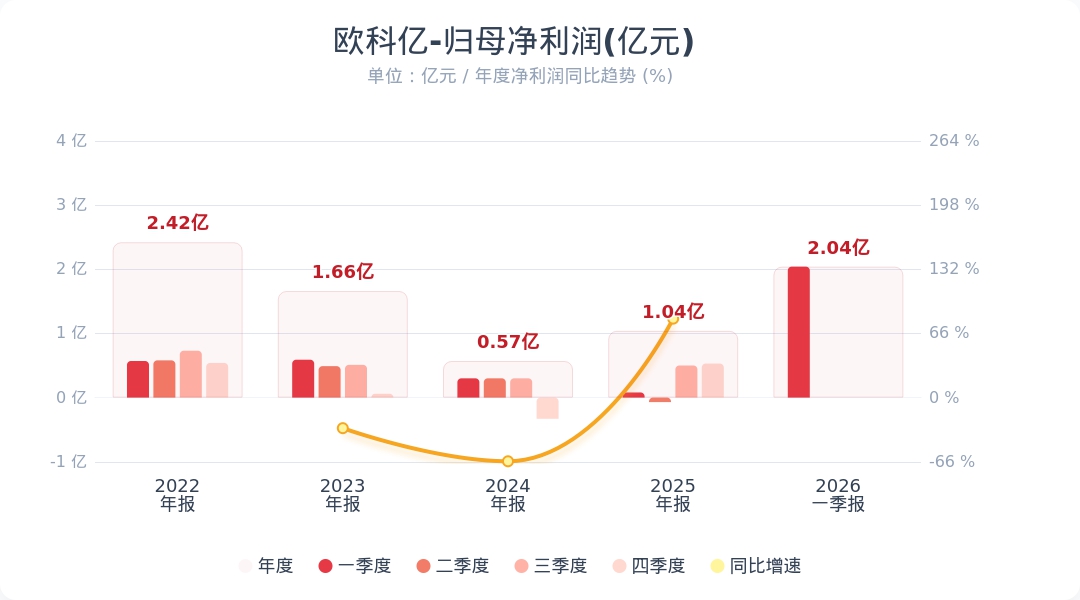 《科创板日报》23日讯,欧科亿(688308.SH)公告称,2026年第一季度实现营业收入6.44亿元,同比增长113.49%;归属于上市公司股东的净利润为2.04亿元,同比增长2560.71%。业绩变动主要系主要原材料涨价,且公司产品量价齐升所致;产品毛利率提升及上年同期基数较低所致。小财注:公司Q1净利润2.04亿,据2025年业绩快报估算,2025年Q4净利润0.53亿,据此计算,Q1净利润环比增长286%。