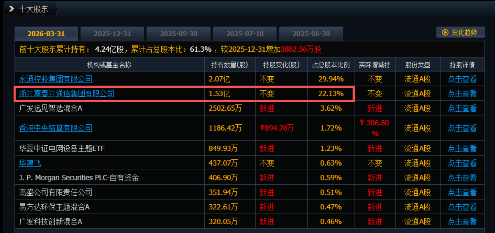 小财注:截至3月31日,浙江富春江通信集团有限公司位列杭电股份第二大股东,持股比例为22.13%。