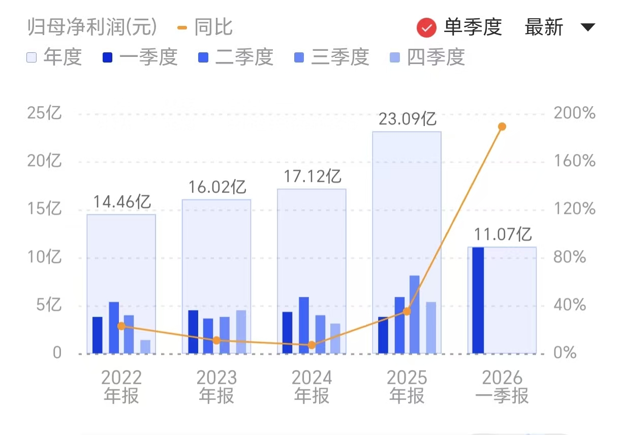 财联社4月23日电,厦门钨业(600549.SH)公告称,2026年第一季度实现营业收入157.43亿元,同比增长86.99%;归属于上市公司股东的净利润为11.07亿元,同比增长189.14%。业绩变动主要系报告期,公司积极应对钨、钴等主要原材料价格上涨,产业链各环节主要产品的售价实现有效联动提升,同时硬质合金、切削工具、电池材料、磁性材料等重点产品销量稳步增长,公司整体盈利得到显著提升。小财注:公司2025年Q4净利润5.28亿,据此计算,2026年Q1净利润环比增长109%。