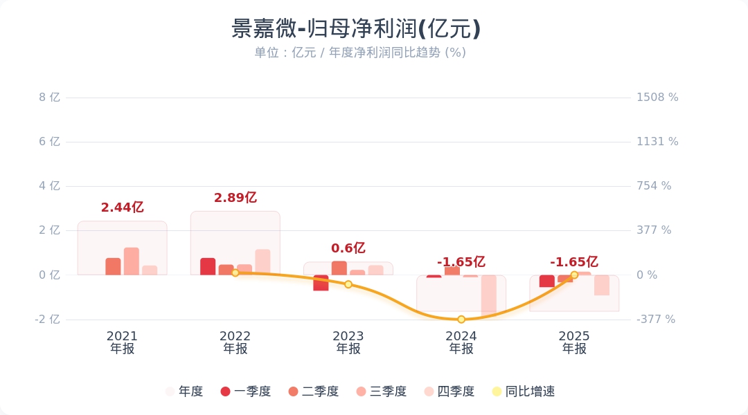 财联社4月23日电,景嘉微(300474.SZ)发布2025年年度报告,实现营业收入7.20亿元,同比增长54.41%;归属于上市公司股东的净利润为-1.65亿元,较2024年净利润-1.65亿元继续亏损。公司计划不派发现金红利,不送红股,不以公积金转增股本。小财注:公司Q4净利润-0.92亿,Q3净利润0.15亿,据此计算,Q4净利润环比由盈转亏。