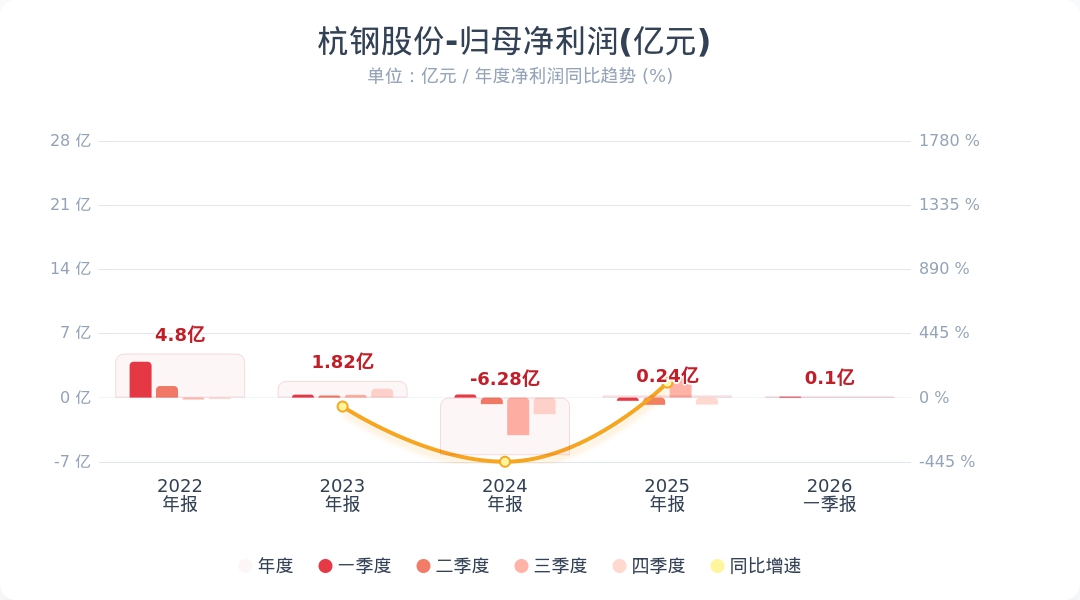 财联社4月24日电,杭钢股份(600126.SH)公告称,2026年第一季度实现营业收入76.93亿元,同比下降46.71%;归属于上市公司股东的净利润为960.76万元,同比扭亏为盈。业绩变动主要系再生资源及再生科技公司本期不再纳入公司合并报表所致;净利润增加主要是宁波钢铁本期大幅减亏、数字经济产业盈利能力增长共同影响所致。小财注:公司Q1净利润0.1亿,2025年Q4净利润-0.76亿,据此计算,Q1净利润环比扭亏为盈。