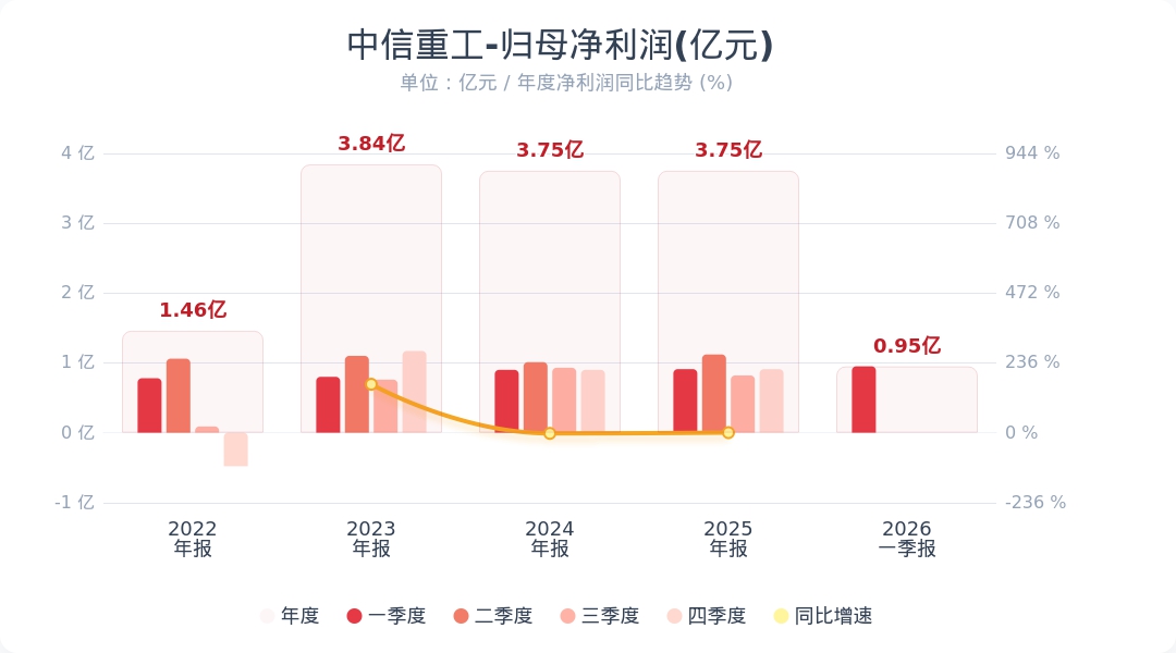 财联社4月24日电,中信重工(601608.SH)公告称,2026年第一季度实现营业收入22.05亿元,同比增长0.58%;归属于上市公司股东的净利润为9508.19万元,同比增长4.57%。小财注:公司Q1净利润0.95亿,2025年Q4净利润0.91亿,据此计算,Q1净利润环比增长5%。