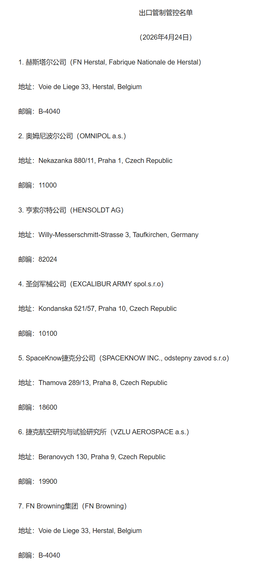 财联社4月24日电,商务部24日发布公告称,为维护国家安全和利益,履行防扩散等国际义务,根据《中华人民共和国出口管制法》和《中华人民共和国两用物项出口管制条例》等法律法规有关规定,决定将赫斯塔尔公司等7家欧盟实体列入出口管制管控名单,并采取以下措施: