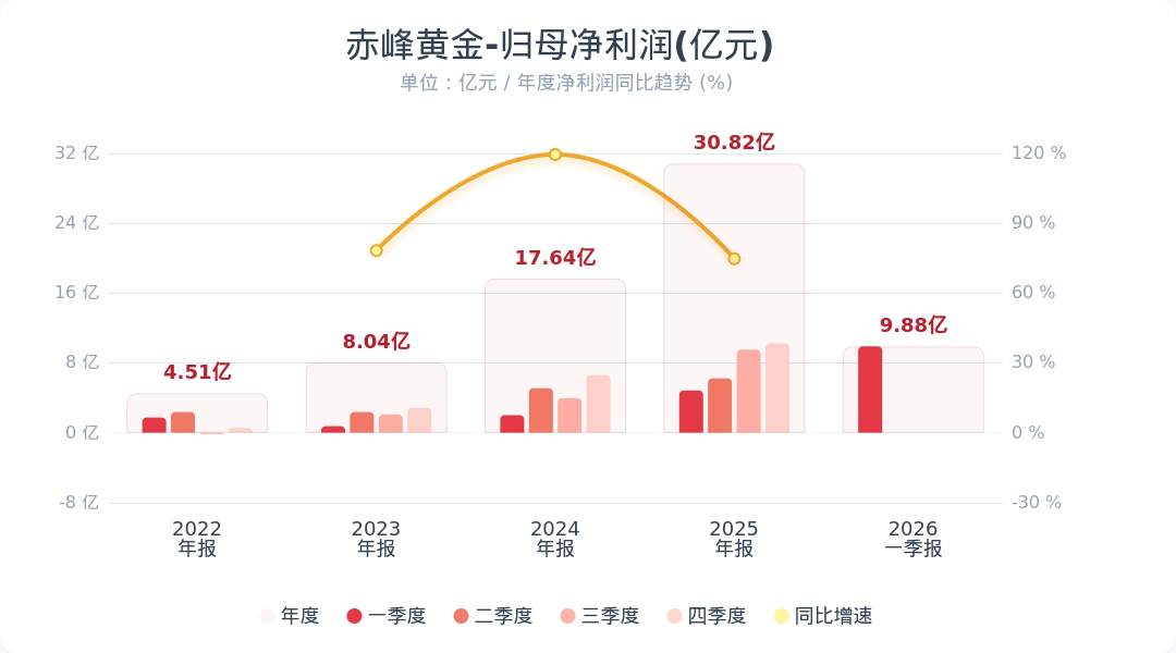 财联社4月24日电,赤峰黄金(600988.SH)公告称,2026年第一季度实现营业收入35.54亿元,同比增长47.65%;归属于上市公司股东的净利润为9.88亿元,同比增长104.43%。业绩变动主要系公司持续优化生产组织与运营管理,并充分受益于黄金价格同比较大幅度上涨。小财注:公司Q1净利润9.88亿,2025年Q4净利润10.24亿,据此计算,Q1净利润环比下降3%。