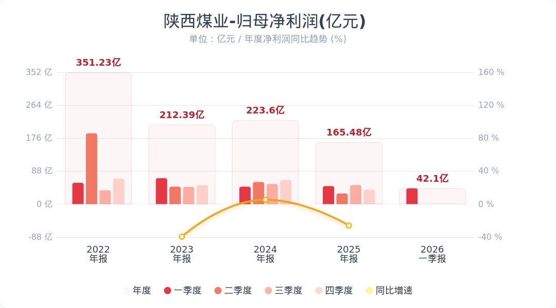 财联社4月24日电,陕西煤业(601225.SH)公告称,2026年第一季度实现营业收入389.53亿元,同比下降3.01%;归属于上市公司股东的净利润为42.10亿元,同比下降12.38%。小财注:公司Q1净利润42.1亿,据2025年业绩快报估算,2025年Q4净利润38.35亿,据此计算,Q1净利润环比增长9%。