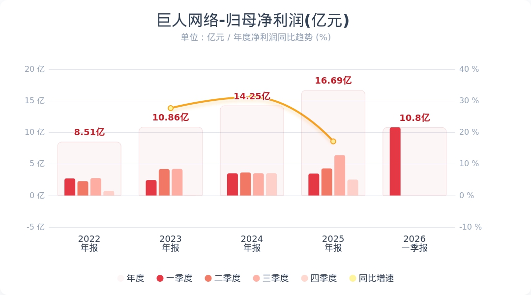 财联社4月27日电,巨人网络(002558.SZ)公告称,2026年第一季度实现营业收入23.29亿元,同比增长221.70%;归属于上市公司股东的净利润为10.80亿元,同比增长210.58%。业绩变动主要系本报告期游戏收入上升所致。小财注:公司Q1净利润10.8亿,据2025年业绩快报估算,2025年Q4净利润2.52亿,据此计算,Q1净利润环比增长328%。
