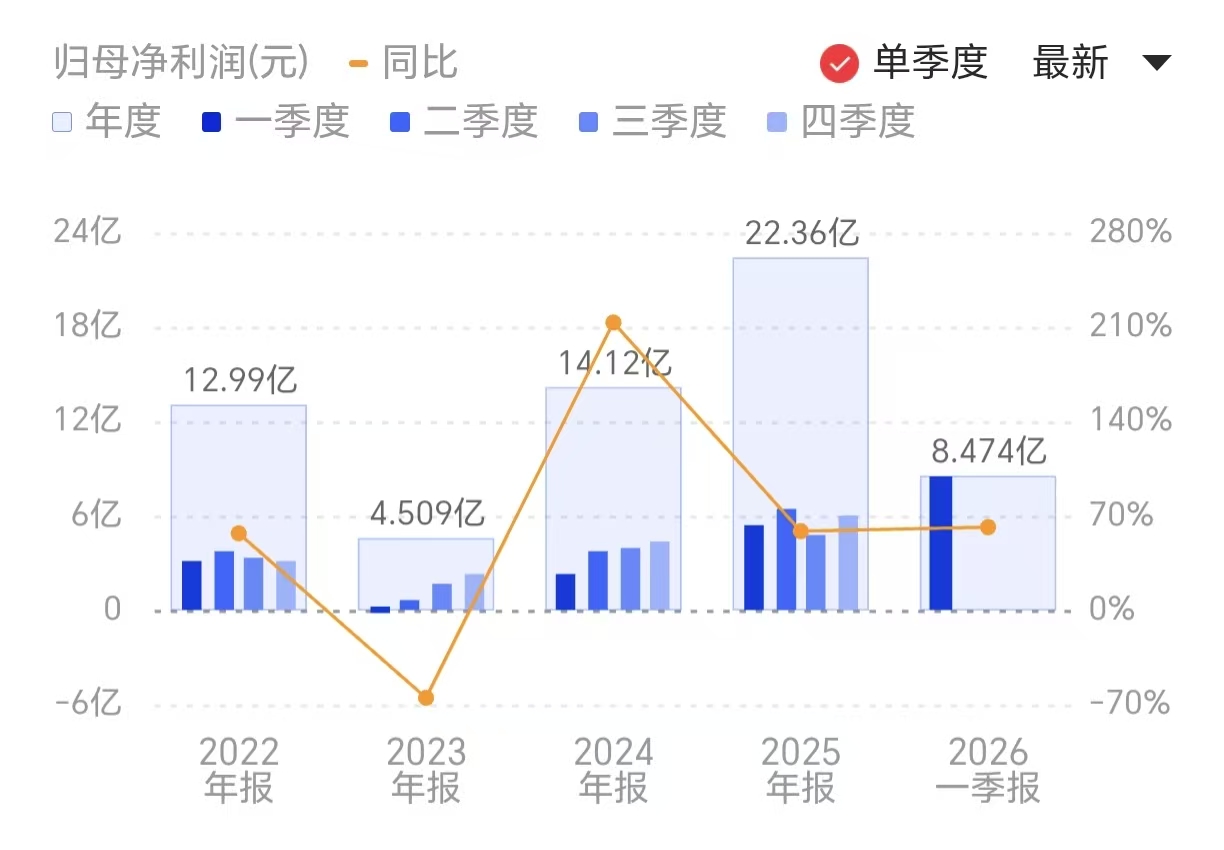 《科创板日报》27日讯,澜起科技(688008.SH)公告称,2026年第一季度实现营业收入14.61亿元,同比增长19.51%;归属于上市公司股东的净利润为8.47亿元,同比增长61.30%。公司营业收入实现增长,主要系受益于AI产业趋势,行业需求旺盛:一方面,随着DDR5渗透率提高且子代持续迭代,公司DDR5RCD芯片出货量显著增加,其中第三、第四子代RCD芯片的出货占比进一步提升;另一方面,互连类芯片新产品MRCD/MDB、PCIeRetimer、CKD及CXLMXC芯片收入显著攀升。公司净利润大幅增长,主要得益于以下因素:(1)营业收入较上年同期增长19.5%;(2)随着DDR5新子代RCD芯片及互连类芯片新产品收入占比提高,互连类芯片毛利率达到71.5%,较上年同期增加7.0个百分点,较上季度增加3.8个百分点,推动公司毛利润达到10.19亿元,较上年同期增长38.0%;(3)投资收益及公允价值变动收益合计2.33亿元,较上年同期增长1235.1%。小财注:公司2025年Q4净利润6.03亿,据此计算,2026年Q1净利润环比增长40%。