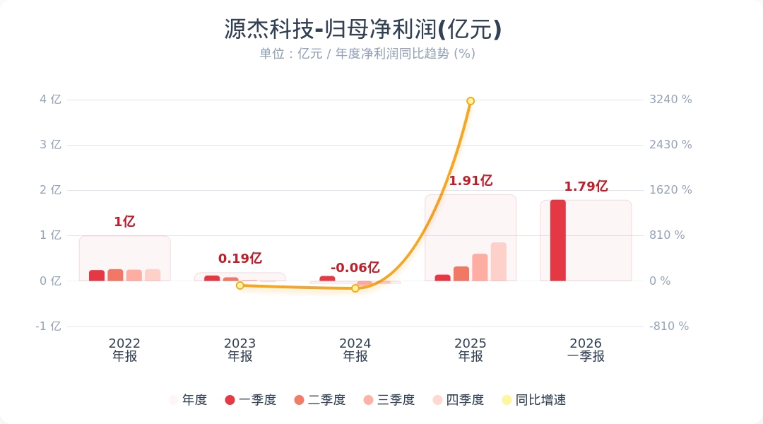 《科创板日报》27日讯,源杰科技(688498.SH)公告称,2026年第一季度实现营业收入3.55亿元,同比增长320.94%;归属于上市公司股东的净利润为1.79亿元,同比增长1153.07%。业绩变动主要系受益于客户需求的增长,数据中心领域CW光源产品销售额实现增长,公司整体产品结构的进一步优化,加之数据中心产品毛利率较高,因而,公司的净利润水平同比增加。小财注:公司Q1净利润1.79亿,2025年Q4净利润0.85亿,据此计算,Q1净利润环比增长111%。