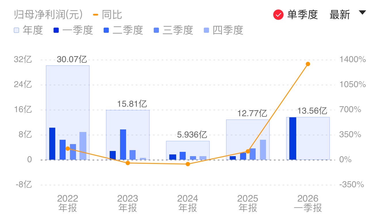 财联社4月27日电,湖南裕能(301358.SZ)公告称,2026年第一季度实现营业收入149.65亿元,同比增长121.31%;归属于上市公司股东的净利润为13.56亿元,同比增长1337.77%。业绩变动主要系本报告期磷酸盐正极材料销售数量较上年同期增长,同时碳酸锂等材料价格上涨带动产品销售价格提升,营业收入随之同比增长。小财注:湖南裕能2025年Q4净利6.32亿元,据此计算,2026年Q1净利环比增长114.57%。