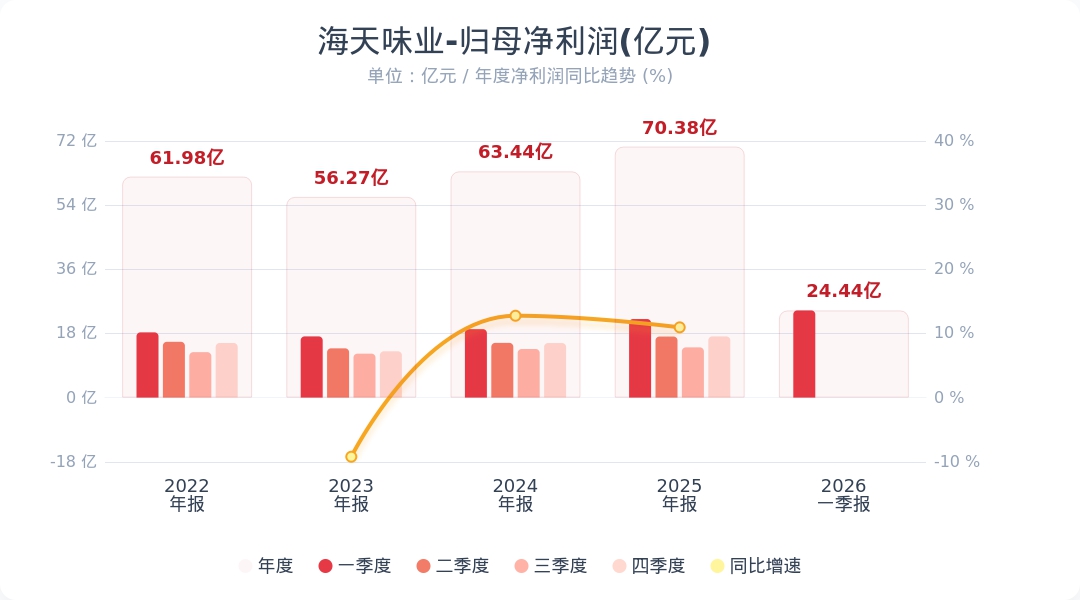 财联社4月27日电,海天味业(603288.SH)公告称,2026年第一季度实现营业收入90.29亿元,同比增长8.57%;归属于上市公司股东的净利润为24.44亿元,同比增长10.97%。小财注:公司Q1净利润24.44亿,2025年Q4净利润17.16亿,据此计算,Q1净利润环比增长42%。