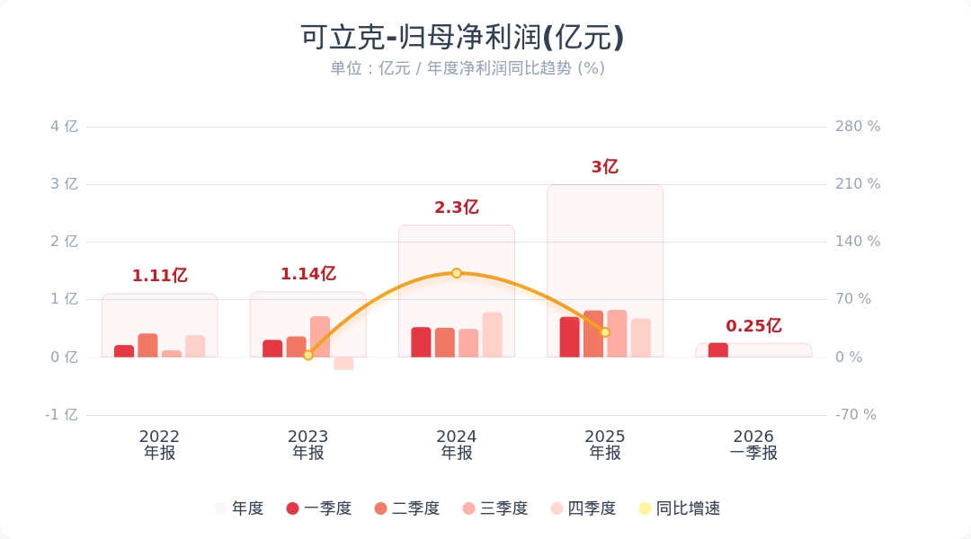 财联社4月27日电,可立克(002782.SZ)公告称,2026年第一季度实现营业收入12.25亿元,同比增长8.87%;归属于上市公司股东的净利润为2546.37万元,同比下降63.63%。业绩变动主要系营业利润减少所致。小财注:公司Q1净利润0.25亿,2025年Q4净利润0.67亿,据此计算,Q1净利润环比下降62%。