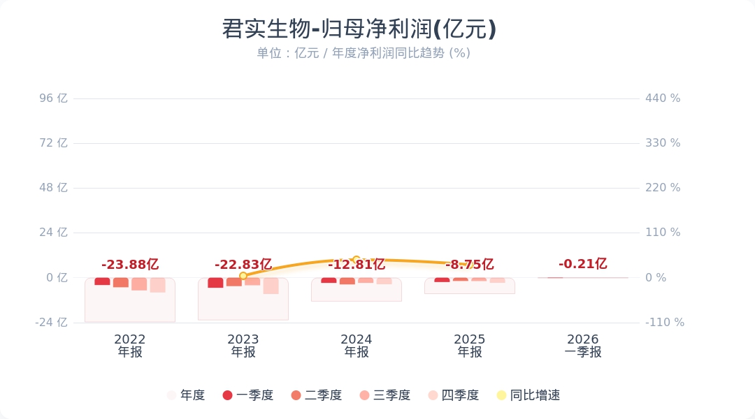 《科创板日报》27日讯,君实生物(688180.SH)公告称,2026年第一季度实现营业收入7.26亿元,同比增长45.09%;归属于上市公司股东的净利润亏损2056.40万元。业绩变动主要系与上年同期相比商业化药品销售收入增长,导致营业收入增长;同时公司积极落实“提质增效重回报”行动方案,提升研发、销售效率,亏损减少。小财注:公司Q1净利润-0.21亿,2025年Q4净利润-2.79亿,据此计算,Q1净利润环比持续亏损。