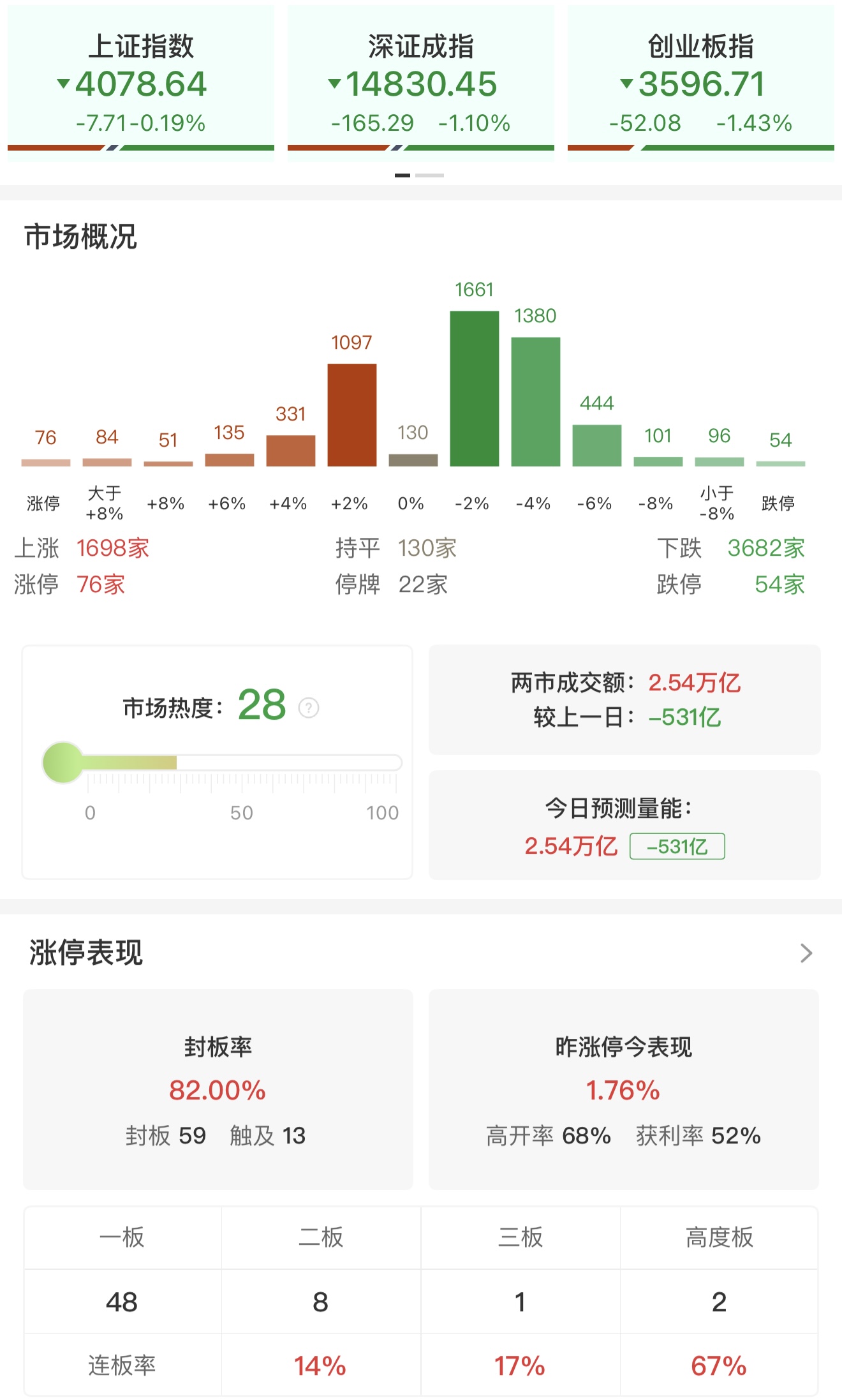 财联社4月28日电,市场全天震荡调整,三大指数低开低走,创业板指、深成指、科创50指数均跌超1%,创业板指日线走出4连阴。沪深两市成交额2.54万亿,较上一个交易日缩量531亿。盘面上,市场热点较为杂乱,全市场超3600只个股下跌。从板块来看,工业气体概念反复活跃,水发燃气7天6板,蜀道装备20CM涨停。绿电概念快速拉升,华电能源4连板,华银电力涨停,华电辽能触及涨停。医药板块表现活跃,药明康德、润都股份、汉森制药、津药药业涨停。算力租赁概念盘中走强,群兴玩具、三人行、利通电子涨停。算力芯片概念延续强势,综艺股份4天3板,仁东控股涨停。煤炭板块震荡走高,昊华能源4天2板。下跌方面,有色金属板块震荡走弱,南山铝业触及跌停,锡业股份、株冶集团、赤峰黄金等纷纷下挫。旅游酒店概念集体调整,陕西旅游跌停,天目湖、丽江股份、金陵饭店跌幅居前。截至收盘,沪指跌0.19%,深成指跌1.1%,创业板指跌1.43%。