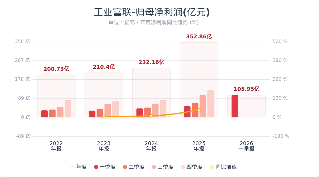 财联社4月28日电,工业富联(601138.SH)公告称,2026年第一季度实现营业收入2510.78亿元,同比增长56.52%;归属于上市公司股东的净利润为105.95亿元,同比增长102.55%。业绩变动主要系受益于AI算力需求持续爆发,公司在主要客户的市场份额稳步提升,以及云服务商业务表现优异,推动整体营业收入增长所致。通讯及移动网络设备方面,公司紧扣数字经济建设与人工智能产业发展机遇,凭借深厚技术积淀与持续高强度研发投入,稳步深化AI相关业务战略布局。2026年第一季度,800G及以上高速交换机出货量同比增长1.6倍,环比增长46%,CPO全光交换机样机开始出货。小财注:公司Q1净利润105.95亿,2025年Q4净利润127.99亿,据此计算,Q1净利润环比下降17%。