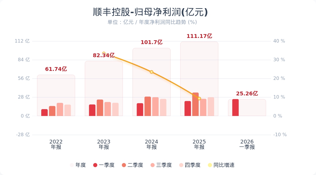 财联社4月28日电,顺丰控股(002352.SZ)公告称,2026年第一季度实现营业收入741.42亿元,同比增长6.14%;归属于上市公司股东的净利润为25.26亿元,同比增长13.05%。业绩变动主要系公司聚焦价值经营、优化业务结构,积极应对外部挑战,保障了业务的持续高质量增长,展现出较强的经营韧性。小财注:公司Q1净利润25.26亿,2025年Q4净利润28.09亿,据此计算,Q1净利润环比下降10%。