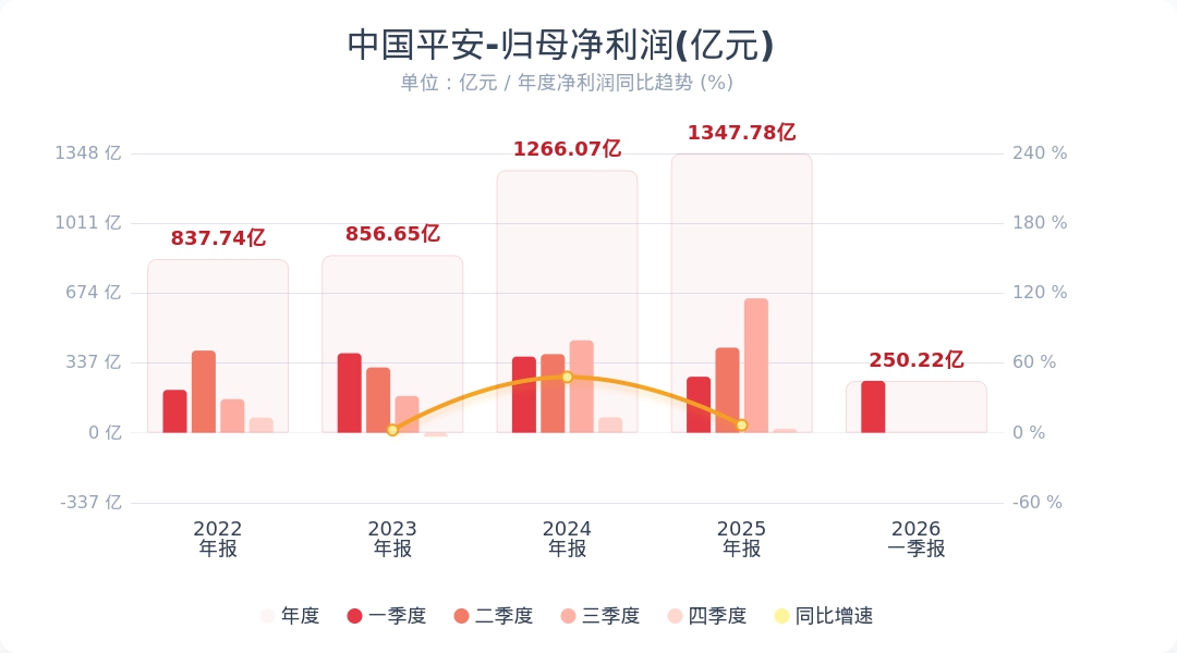 财联社4月28日电,中国平安(601318.SH)公告称,2026年第一季度实现营业收入2184.05亿元,同比下降6.2%;归属于母公司股东的净利润为250.22亿元,同比下降7.4%。业绩变动主要系外部环境不确定性因素较多,地缘政治风险上升。小财注:公司Q1净利润250.22亿,2025年Q4净利润19.22亿,据此计算,Q1净利润环比增长1201%。