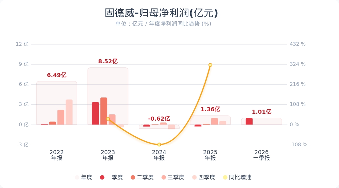 《科创板日报》28日讯,固德威(688390.SH)公告称,2026年第一季度实现营业收入23.61亿元,同比增长25.42%;归属于上市公司股东的净利润为1.01亿元,上年同期亏损,同比扭亏为盈。业绩变动主要系本期境外逆变器及储能电池销售额与毛利额显著提升。小财注:公司Q1净利润1.01亿,据2025年业绩快报估算,2025年Q4净利润0.55亿,据此计算,Q1净利润环比增长84%。