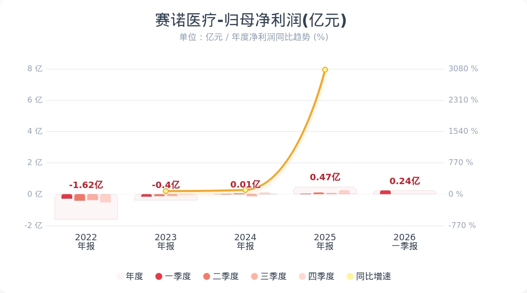 财联社4月28日电,赛诺医疗(688108.SH)公告称,2026年第一季度实现营业收入1.40亿元,同比增长38.56%;归属于上市公司股东的净利润为2446.28万元,同比增长723.85%。业绩变动主要系:(1)冠脉业务产品销量同比实现显著增长,使得该业务收入较上年同期增长19.69%;(2)神经业务于上年四季度进入规模销售阶段的新品涂层密网支架,其收入在本报告期内继续确认,进而推动该业务收入同比增长72.69%;综上,营业收入较上年同期增长38.56%。小财注:公司Q1净利润0.24亿,2025年Q4净利润0.26亿,据此计算,Q1净利润环比下降6%。