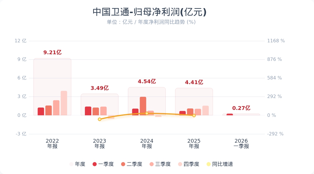 财联社4月29日电,中国卫通(601698.SH)公告称,2026年第一季度实现营业收入5.42亿元,同比增长0.71%;归属于上市公司股东的净利润为2684.15万元,同比下降61.90%。业绩变动主要因卫星折旧成本增加。小财注:公司Q1净利润0.27亿,2025年Q4净利润1.55亿,据此计算,Q1净利润环比下降82%。