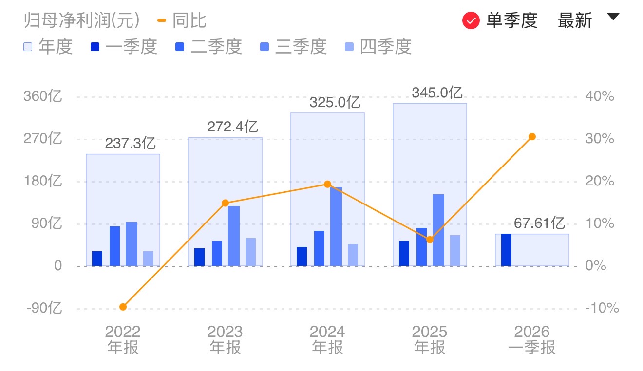 财联社4月29日电,长江电力(600900.SH)公告称,2026年第一季度实现营业收入181.12亿元,同比增长6.44%;归属于上市公司股东的净利润为67.61亿元,同比增长30.50%。业绩变动主要系公司售电收入增加及所持金融资产浮盈所致。小财注:长江电力2025年Q4净利63.1亿元,据此计算,2026年Q1净利环比增长7.15%。