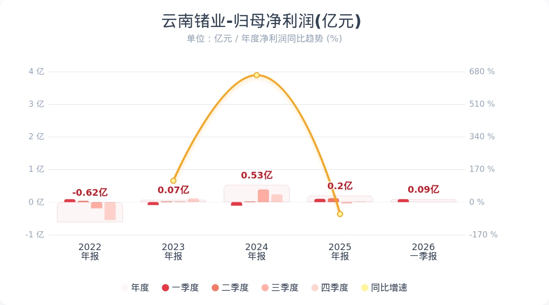 财联社4月29日电,云南锗业(002428.SZ)公告称,2026年第一季度实现营业收入2.89亿元,同比增长20.31%;归属于上市公司股东的净利润为910.71万元,同比下降10.71%。由于本期下游高速光模块需求增加,使得化合物半导体销量同比增加;材料级锗产品本期按合同约定交付上年末待履约产品使得销量同比增加;本期光伏级锗产品、光纤级锗产品、红外级锗产品(镜头、光学系统)受上游原材料价格波动的影响,公司基于成本传导需求调整了定价策略,部分新订单尚处于商务谈判过程中,导致销量同比下降。小财注:公司Q1净利润0.09亿,2025年Q4净利润0.02亿,据此计算,Q1净利润环比增长355%。