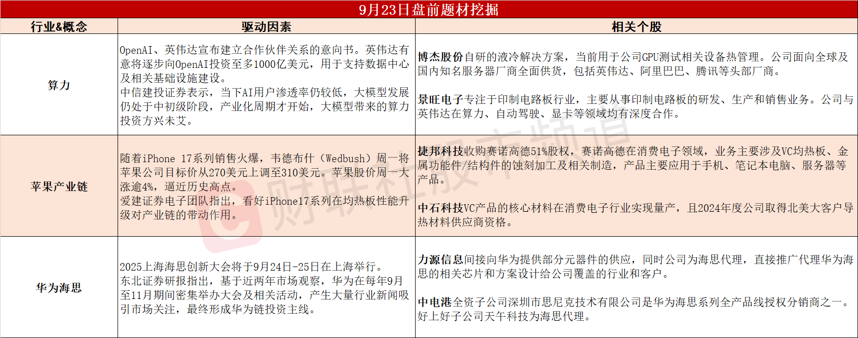 ①英伟达将投资千亿美元兴建数据中心,机构称算力产业化方兴未艾。②苹果股价大涨逾4%,iPhone17销售火爆有望打开果链上行空间。③海思创新大会将于明日举行,华为链有望站上市场风口。