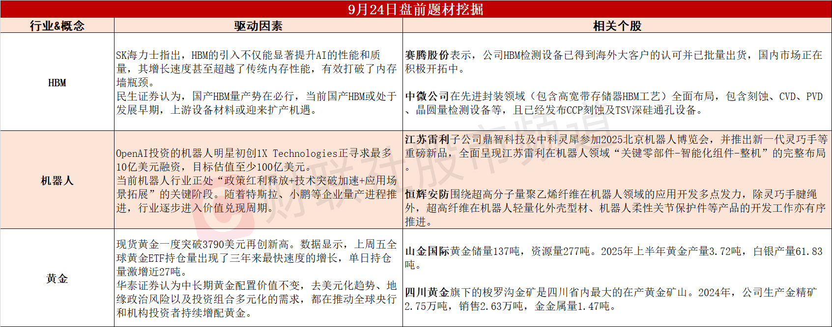①HBM已成当下AI芯片主流选择,机构称HBM国产化势在必行。②机器人明星初创公司估值达百亿美元,“AI+机器人”赛道火爆。③全球黄金ETF持仓量激增,黄金中长期配置价值有望持续上升。