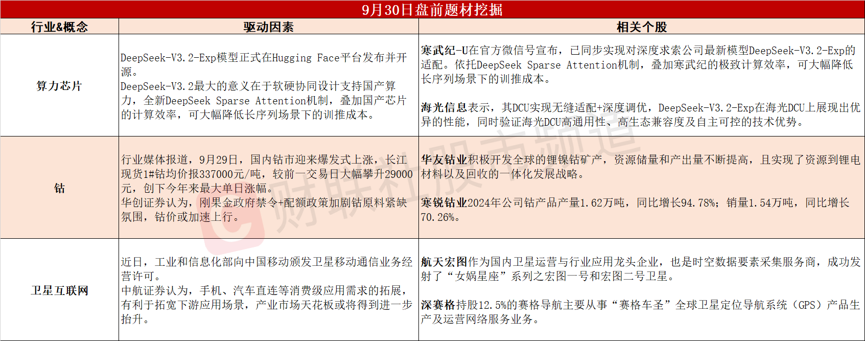 ①DeepSeek-V3.2-Exp发布并开源,国产芯片深度协同有望全面受益。②中国移动获卫星移动通信业务经营许可,卫星互联网应用需求有望拓展。③国内钴市迎来爆发式上涨,机构称原料紧缺或使钴价加速上行。