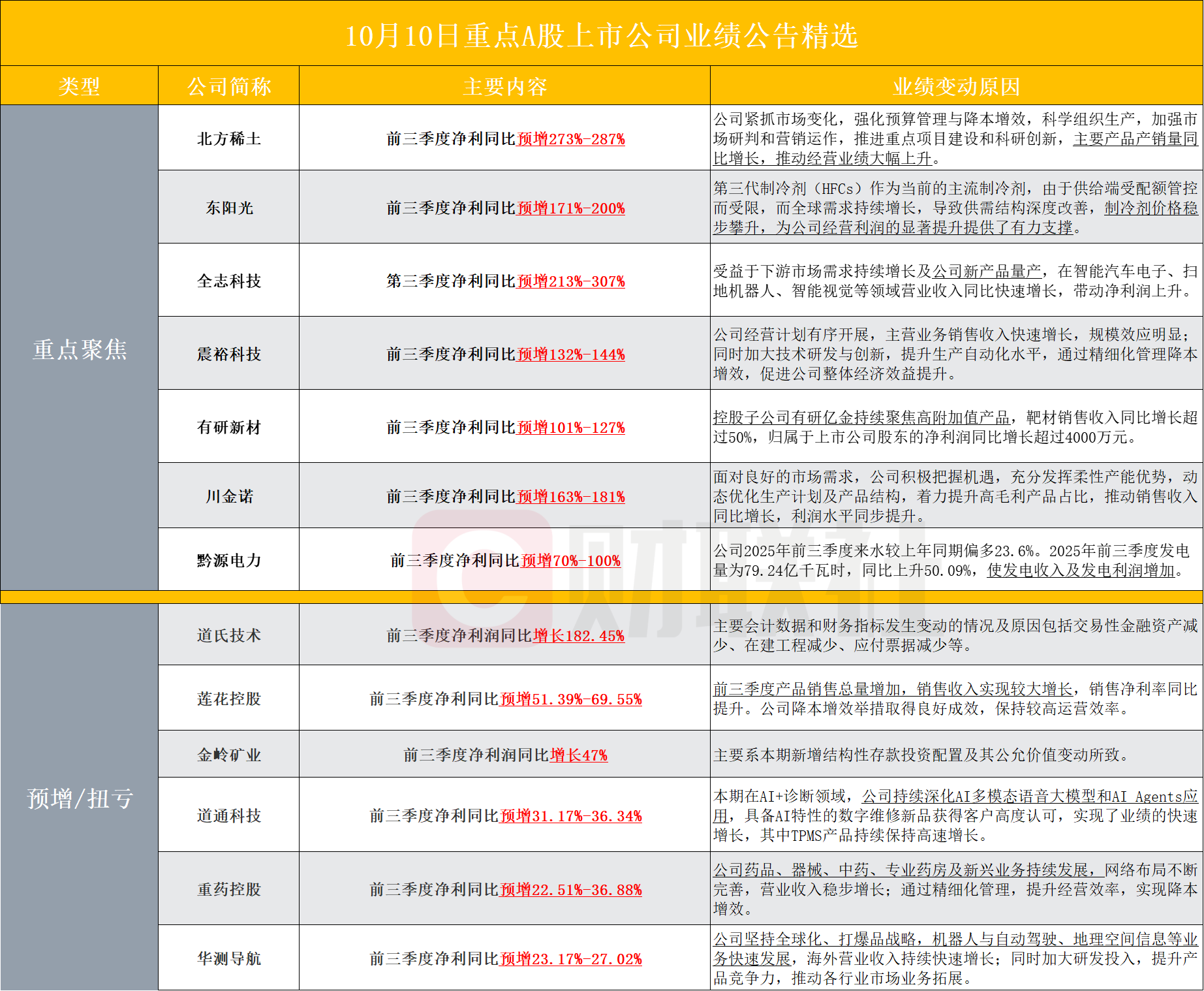财联社10月10日电,据财联社不完全统计,截至发稿,盘后包括北方稀土、东阳光、全志科技、震裕科技、有研新材、川金诺、黔源电力、道氏技术、莲花控股、金岭矿业、道通科技、重药控股和华测导航在内的多家A股上市公司发布2025年三季度业绩报告或预告。其中,北方稀土前三季度净利同比预增273%-287%,全志科技第三季度净利同比预增213%-307%。