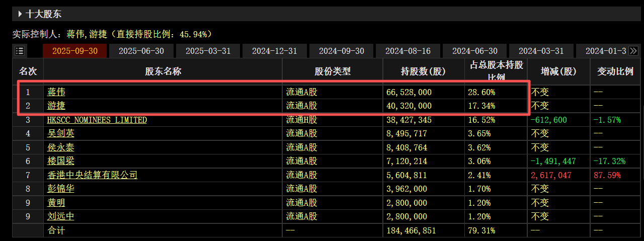 截至三季度末,蒋伟位列昊海生科第一大股东,持股比例28.6%,游捷位列第二大股东,持股比例17.34%。蒋伟和游捷为夫妻关系,是公司控股股东、实际控制人。蒋伟未在公司任职,游捷任公司非执行董事。