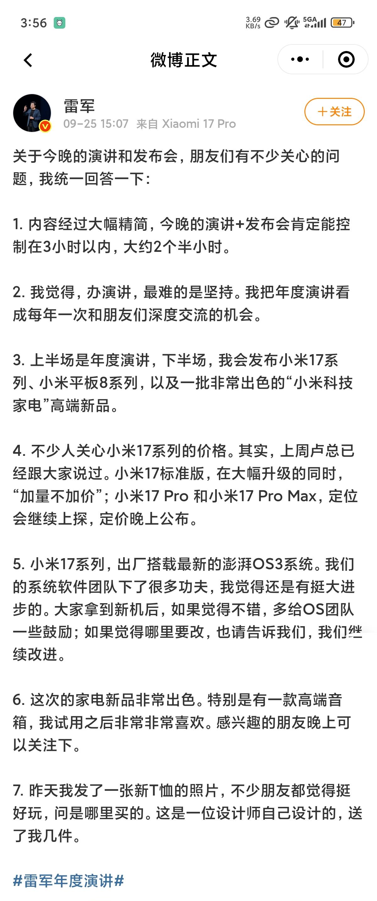 《科创板日报》25日讯,今日(9月25日),小米创办人,董事长兼CEO雷军发文透露今晚年度演讲内容,雷军称,上半场是年度演讲,下半场将发布小米17系列、小米平板8系列以及“小米科技家电”新品。在价格上,小米17标准版,在大幅升级的同时,“加量不加价”;小米17 Pro 和小米17 Pro Max,定位则会继续上探。(记者 余诗琪)