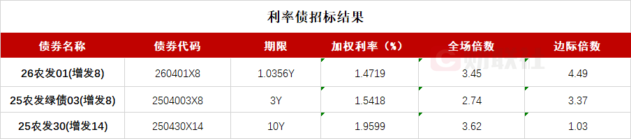 【农发行三期金融债已结束招标 10年期品种中标收益率1.9599%】
