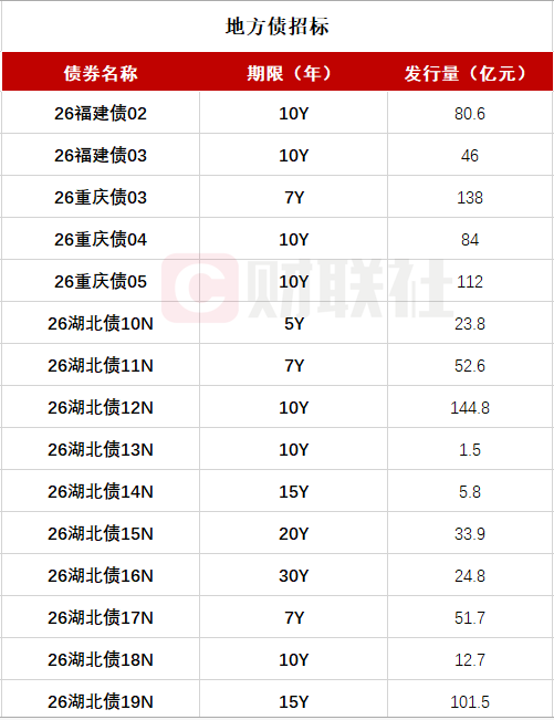 【今日将发行三批次地方债,包括福建、重庆、湖北】