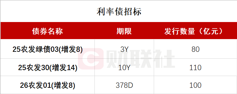 财联社2月2日电,按照此前公布的发行计划,中国农业发展银行将于下午14:00-15:00招标发行三期固息金融债,分别为:2025年第三期绿色金融债券(第八次增发),期限3年,发行量不超过80亿元,票面利率1.59%;2025年第三十期金融债券(第十四次增发),期限10年,发行量不超过110亿元,票面利率1.82%;2026年第一期金融债券(第八次增发),期限378D,发行量不超过100亿元,票面利率1.5%。