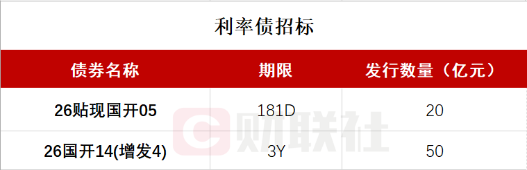 财联社2月2日电,按照此前公布的发行计划,国家开发银行将于下午14:30-15:30招标发行两期金融债,分别为:2026年第五期贴现金融债券,期限181D,发行量不超过20亿元;2026年第十四期金融债券(第四次增发),期限3年,发行量不超过50亿元,票面利率1.68%。