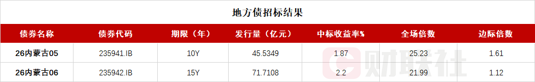 【内蒙古自治区政府两期地方债已招标结束 投标倍数均在21倍之上】