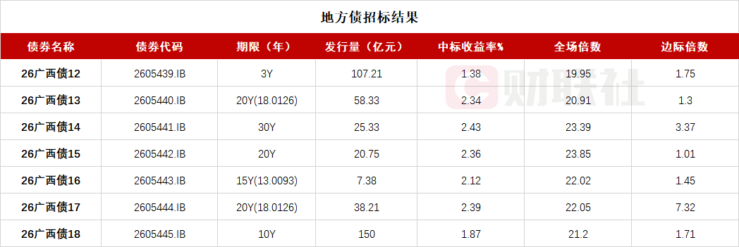 【广西省政府七期地方债已招标结束 投标倍数均在19倍之上】