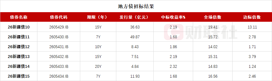 【新疆自治区政府六期地方债已招标结束 投标倍数均在14倍之上】