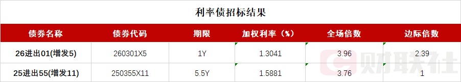 【中国进出口银行两期金融债已结束招标 1年期品种中标收益率1.3041%】