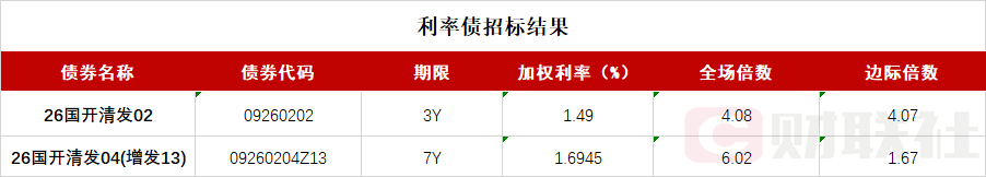 【国开行两期金融债已结束招标 3年期品种中标收益率1.6945%】